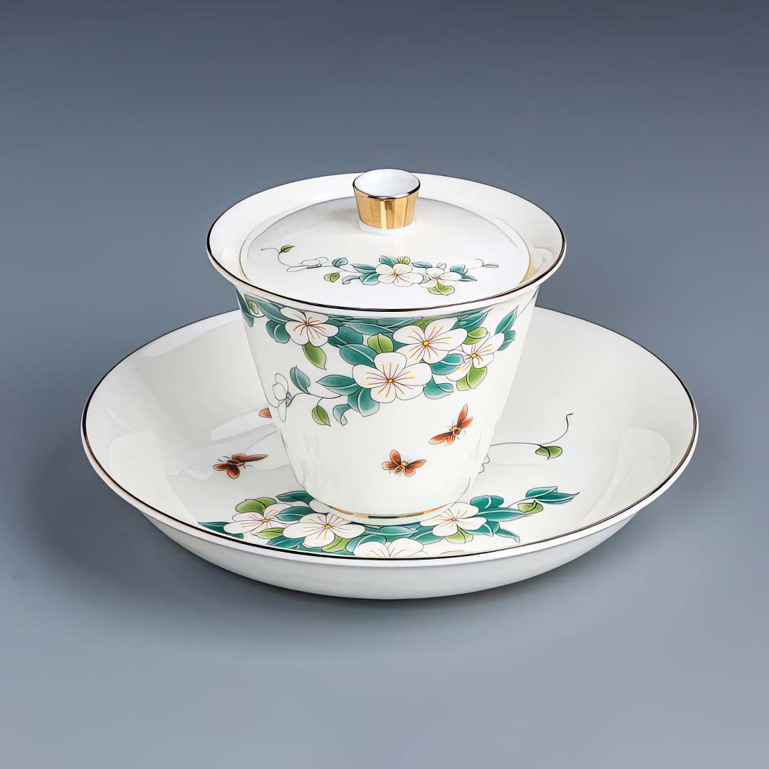 Утонченная фарфоровая гайвань с блюдцем, родом из Дэхуа. Стенки тоньше средних. Блюдце, сама гайвань и крышечка с позолоченной окантовкой. Снаружи гайвань украшена изображением камелии – цветок благородства, совершенства и долговечности. В Азии символизирует верность и гармонию.
