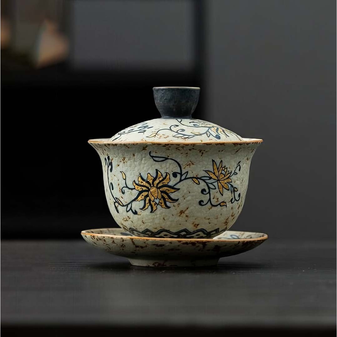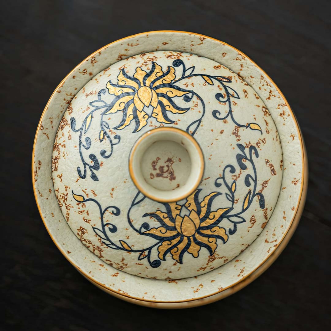 Керамическая гайвань с блюдцем, родом из провинции Фуцзянь. Стенки чуть тоньше средних. Гайвань покрыта авторской глазурью, имитирующей древний камень с золотой инкрустацией.
