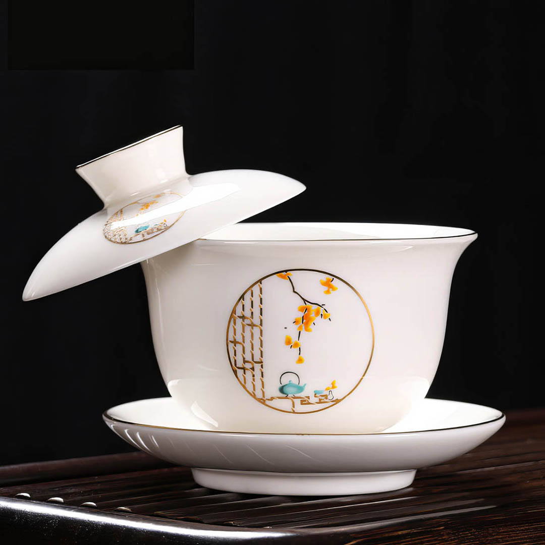 Стенки средней толщины. Гайвань украшена красивым пейзажем с изображением чаепития и осенним настроением.