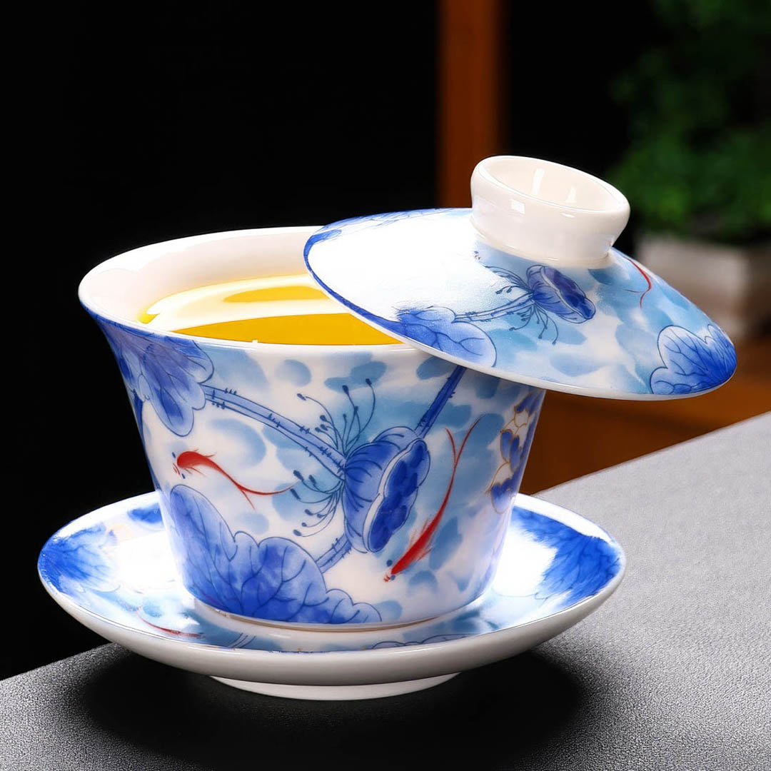 Стенки средней толщины. Гайвань украшена умиротворяющим видом рыбок, играющих среди цветов лотоса. В Китае лотос символизирует чистоту, духовное раскрытие, мудрость.
