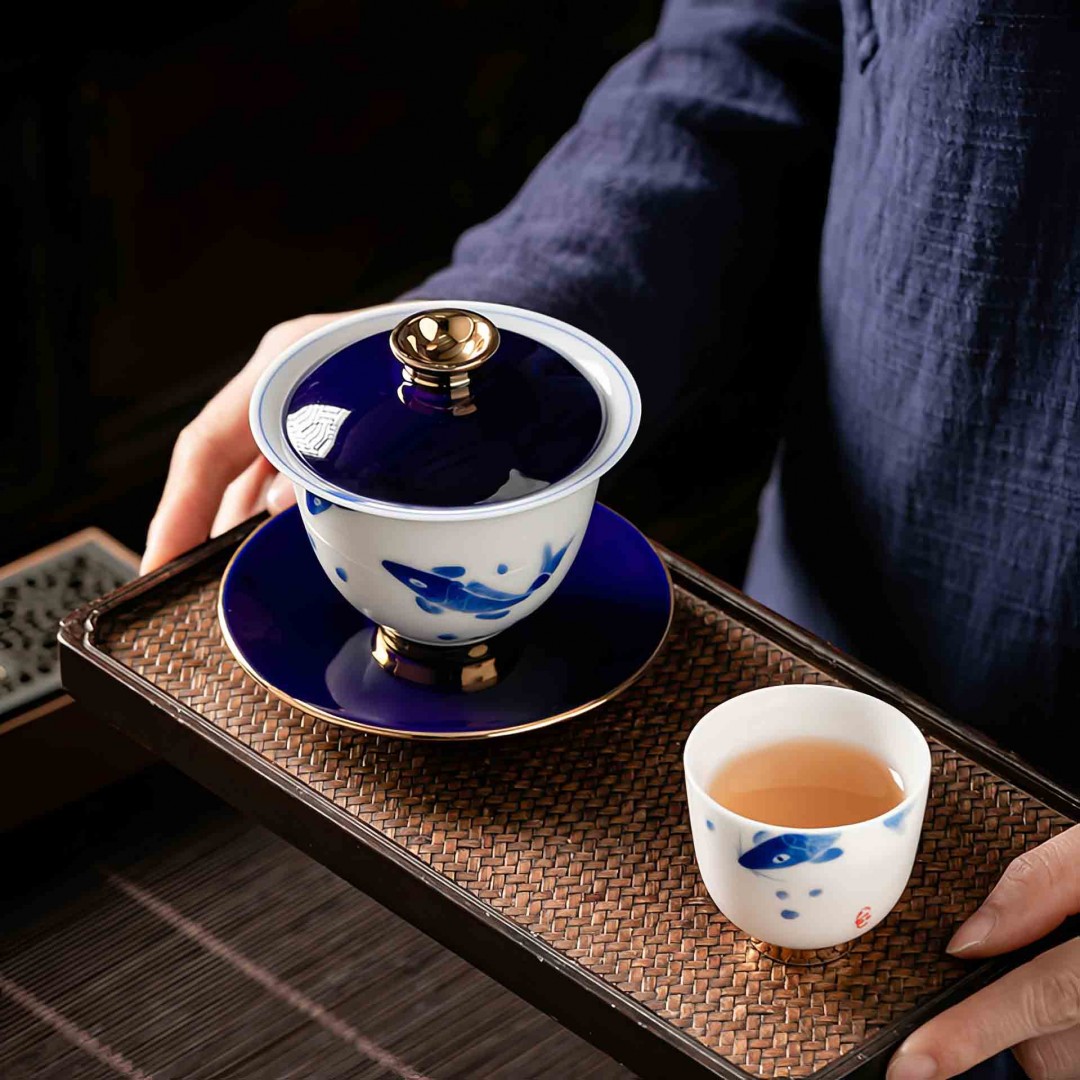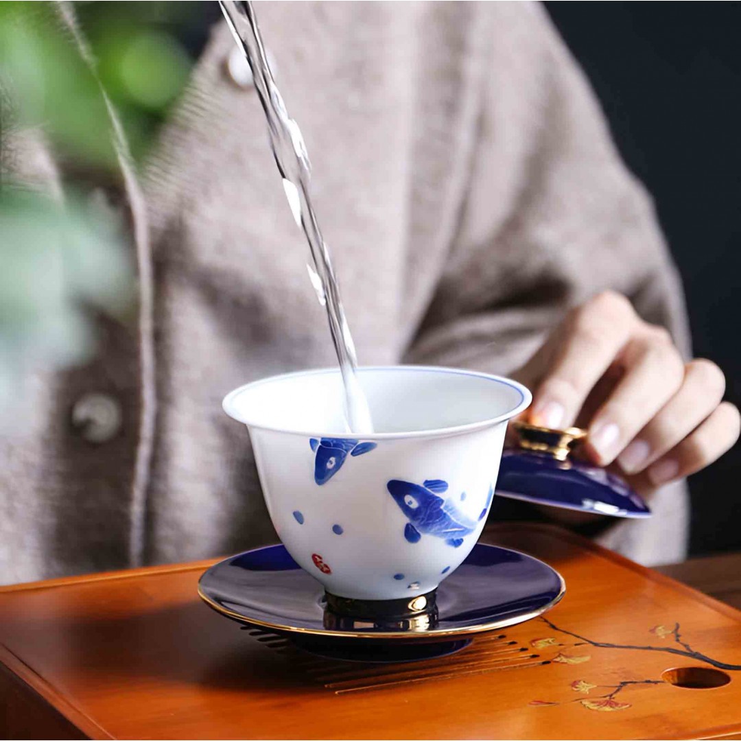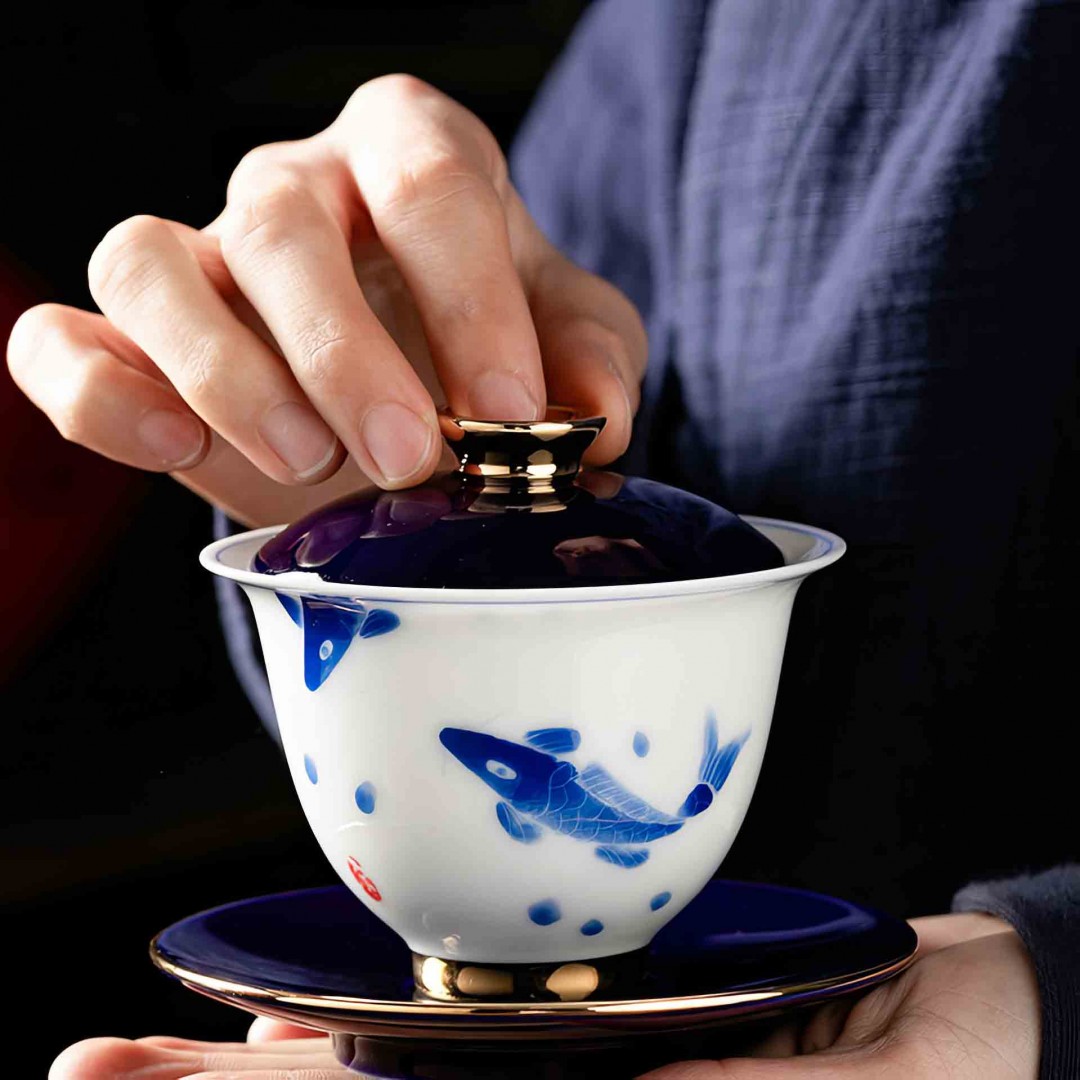 Фарфоровая гайвань с блюдцем, родом из Дэхуа. Ручная роспись, тонкостенные.Технология Сань-Цай — это трехцветное глазурование керамики, где каждый предмет получает уникальную комбинацию оттенков. Ваши гайвани построены по принципу «белая основа + акцентный цвет + золотой (жёлтый)» как третий обязательный компонент. Цвета также имеют культурное значение: синий — бесконечность неба и глубина воды, золото — власть. Оберег от хаоса, символ контроля и порядка.Полный объем: 170 мл.Рабочий объем: 140 м Читать полностью