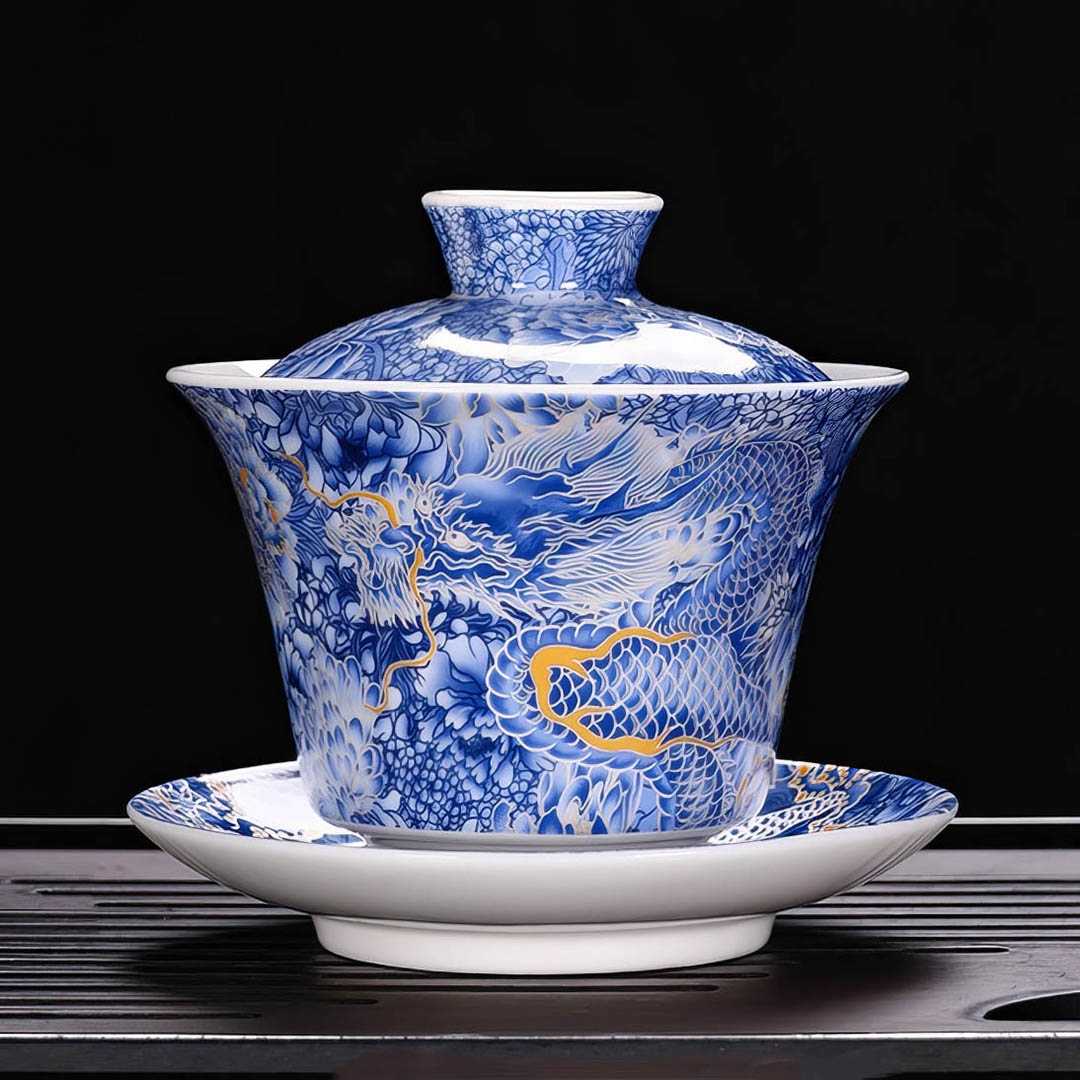 Стенки средней толщины. Гайвань украшена Синим Драконом. Самое фундаментальное значение Синего Дракона связано с системой «Сы Шэ» — Четыре Небесных Символа. В этой системе он управляет восточной частью неба и соответствует одному из четырех сезонов.