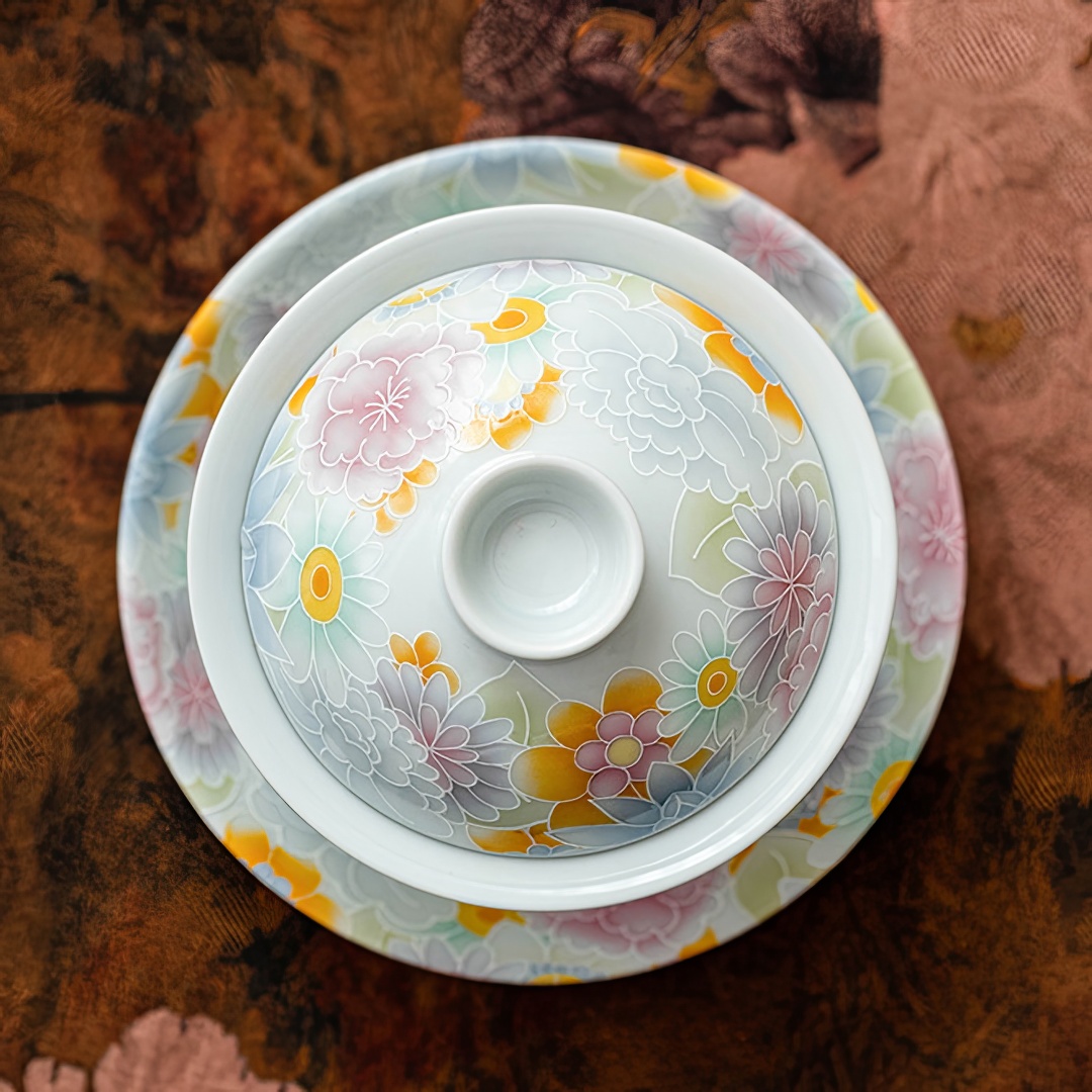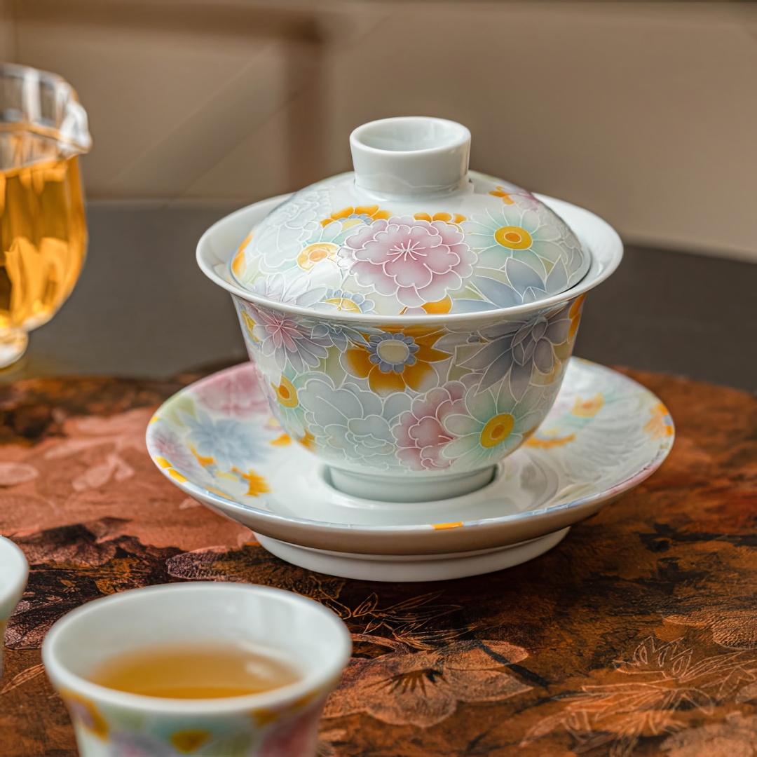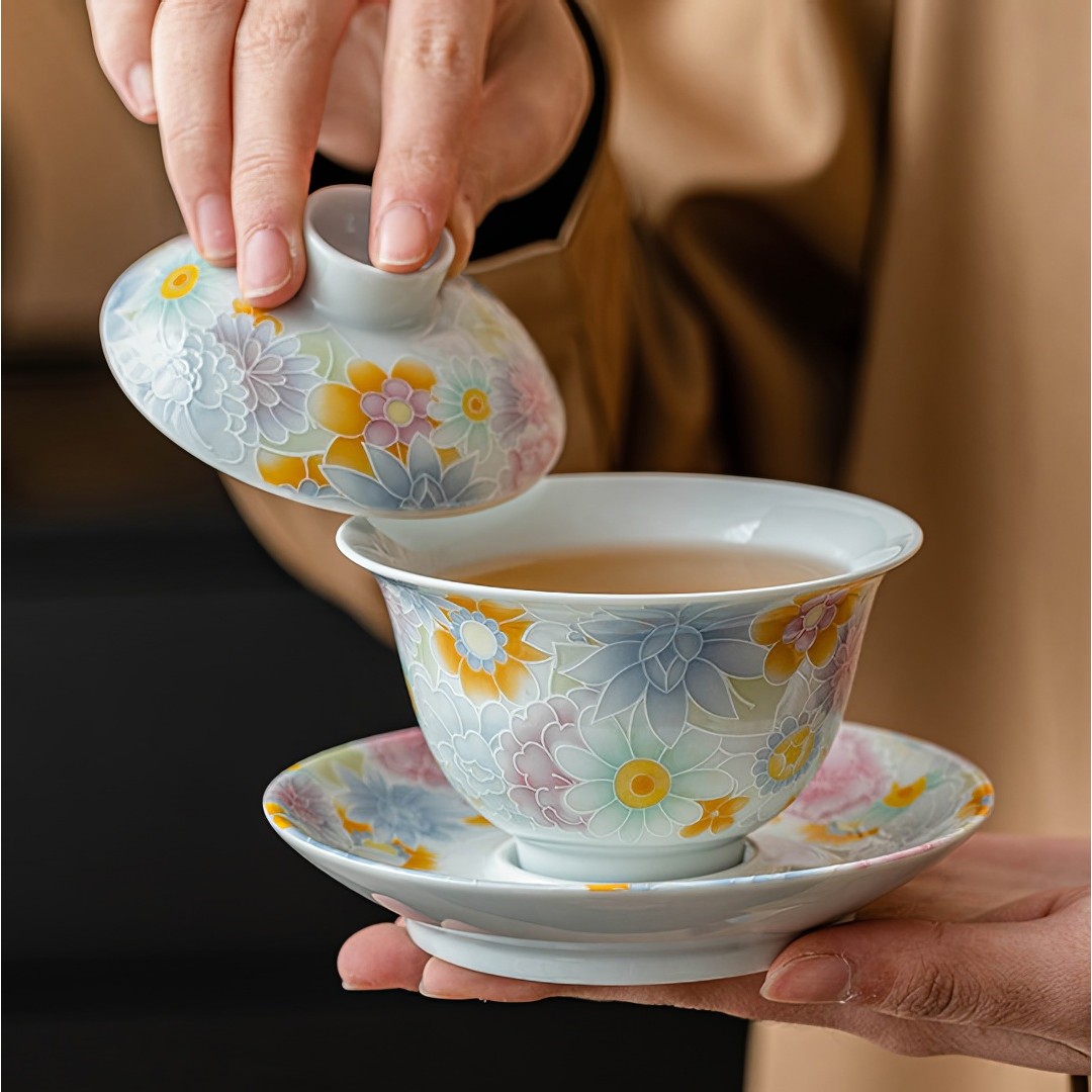 Гайвань покрыта нежной глазурью небесного цвета и украшена рельефными изображениями цветов.