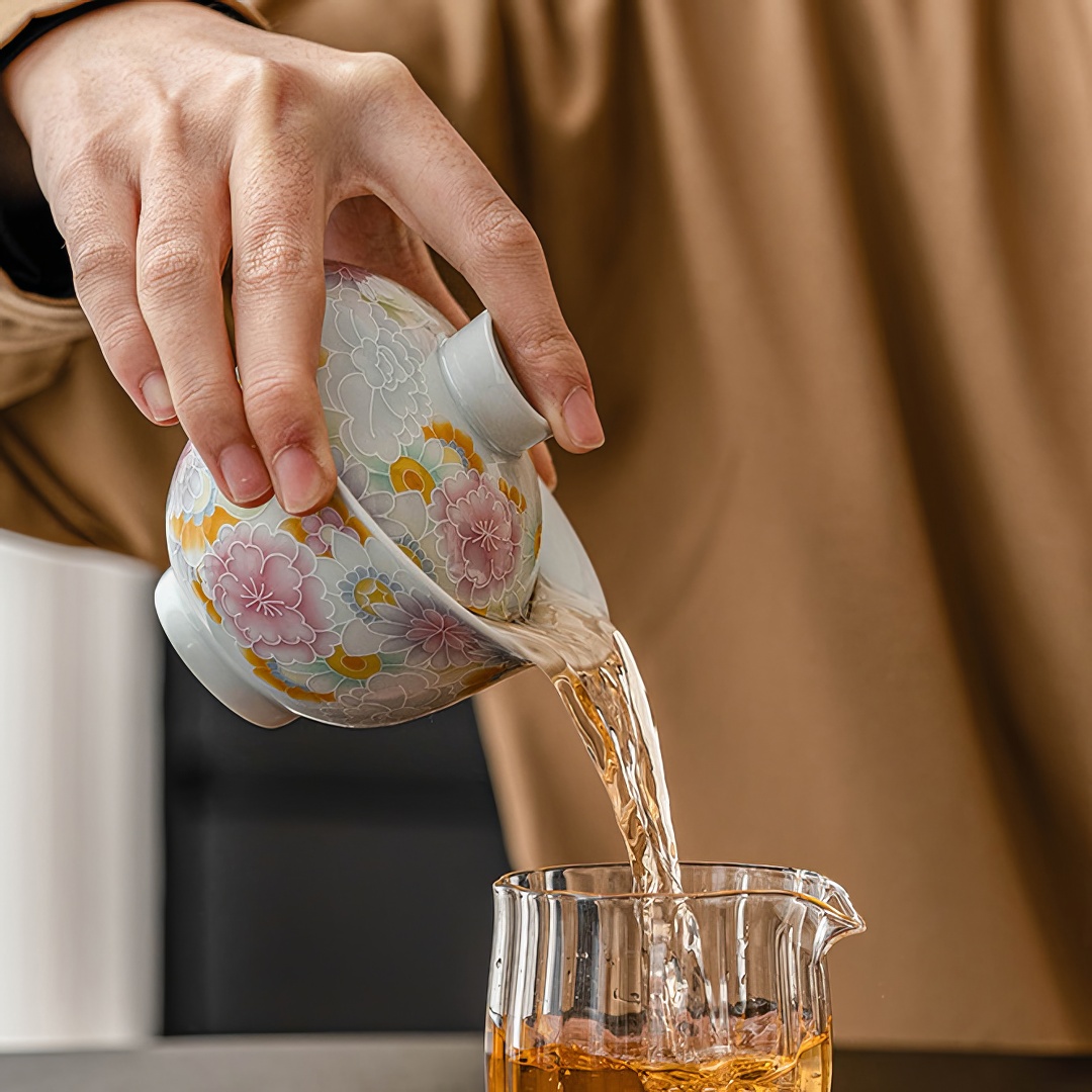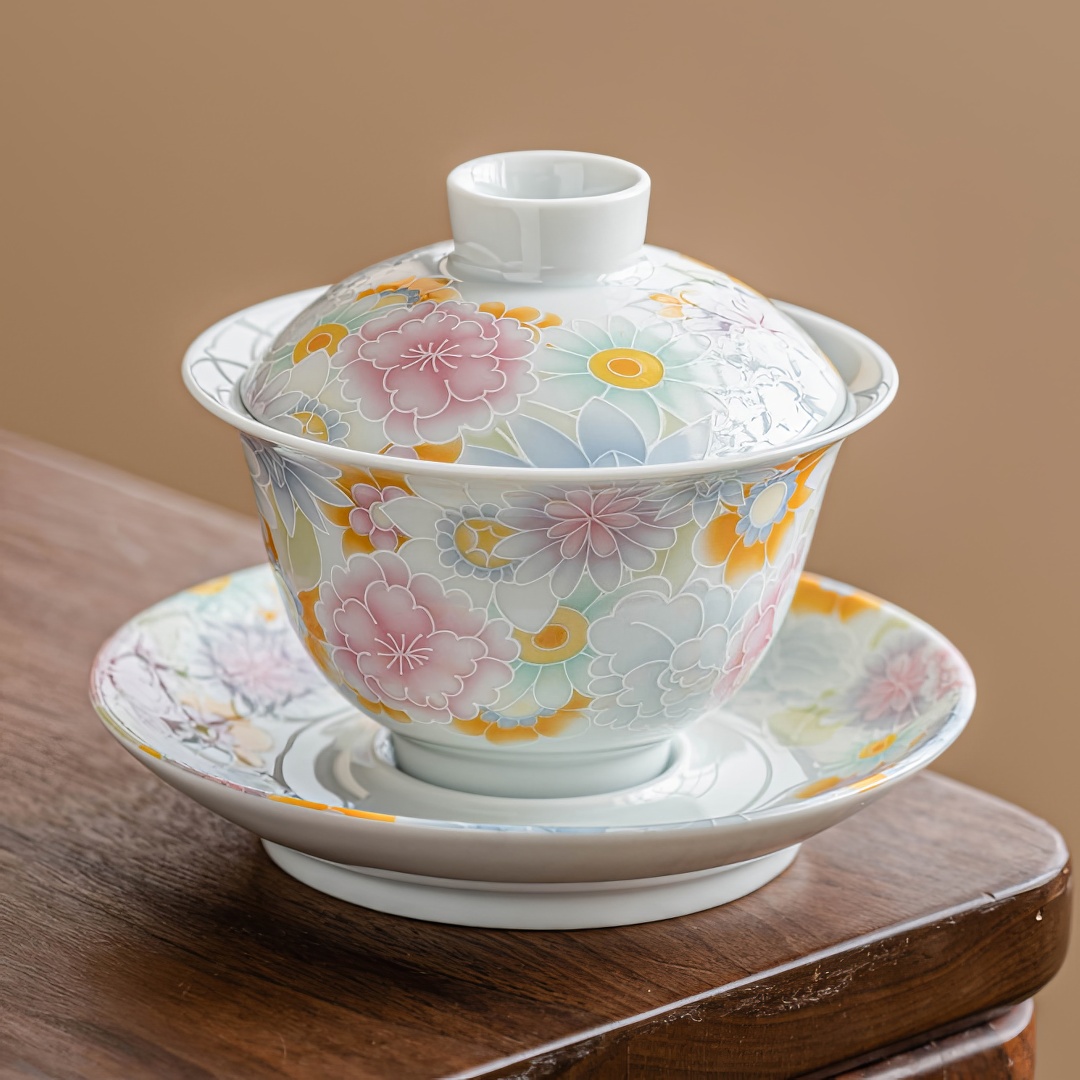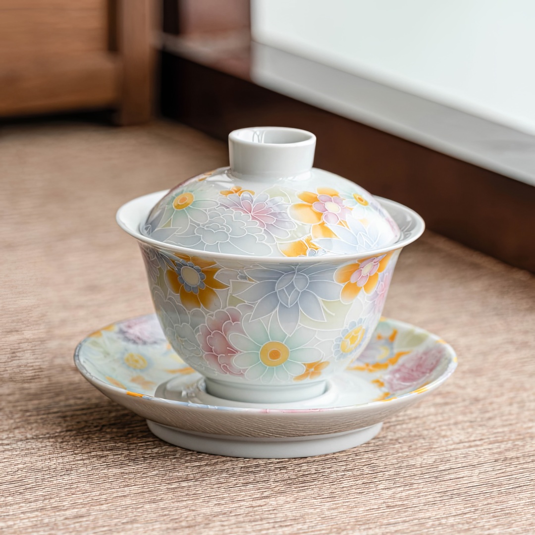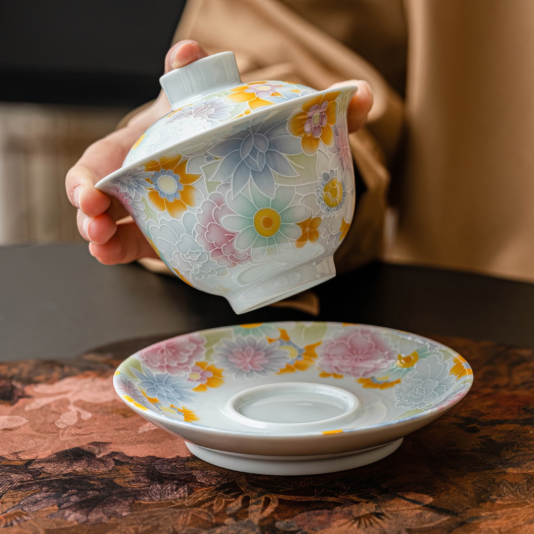 Гайвань покрыта нежной глазурью небесного цвета и украшена рельефными изображениями цветов.
