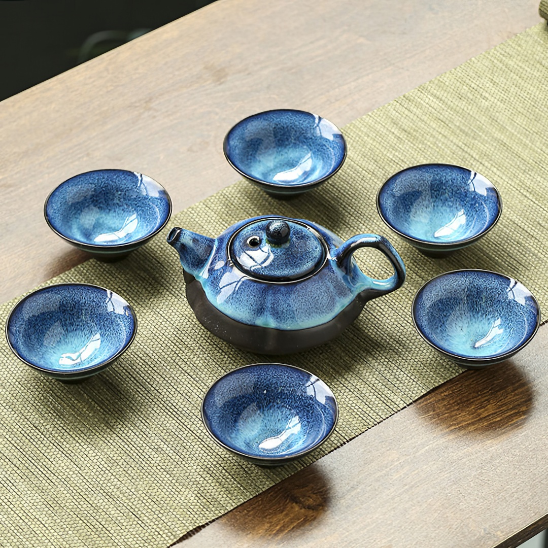 В набор входит чайник и 6 пиал. Посуда покрыта глазурью, имитирующей Тянь Му, что в переводе означает "Небесное око".