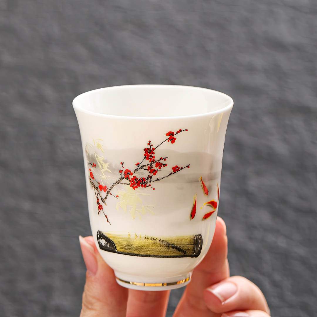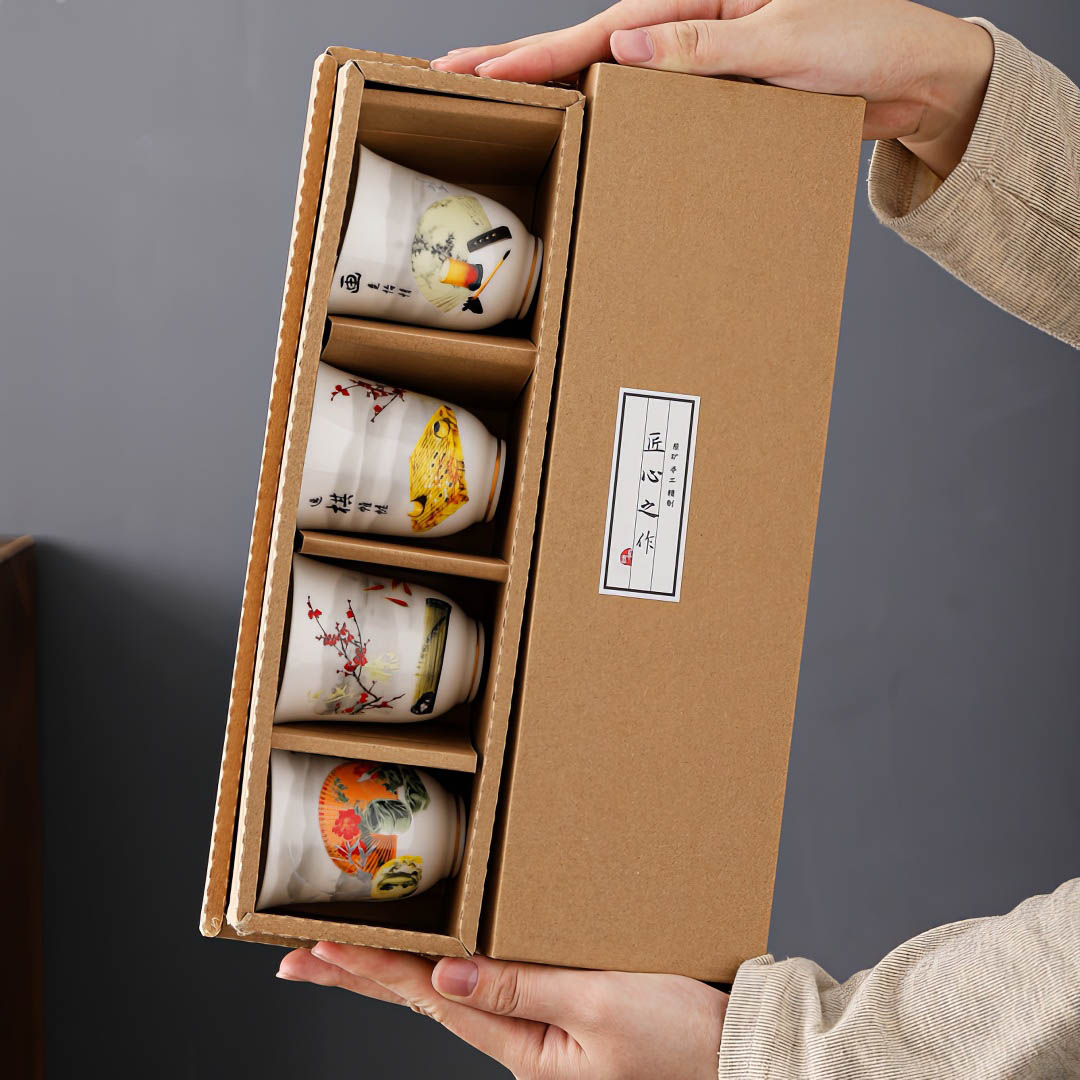 Набор из четырех фарфоровых пиал, покрытых глянцевой глазурью. Каждая пиала — воплощение одного из Четырёх Искусств — путь к совершенству благородного мужа. Игра на цитре взращивает гармонию души, мудрая игра в го оттачивает ясность стратегического ума, каллиграфия запечатлевает силу духа, а живопись тушью раскрывает единение с природой. Вместе они воплощают идеал учёного: мудрость, стойкость, глубину и безупречный вкус.