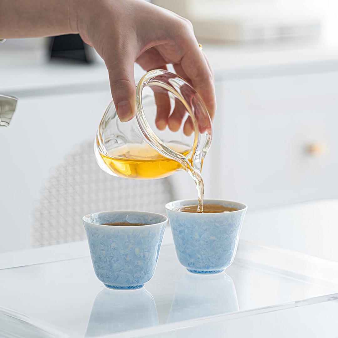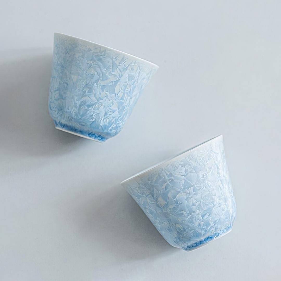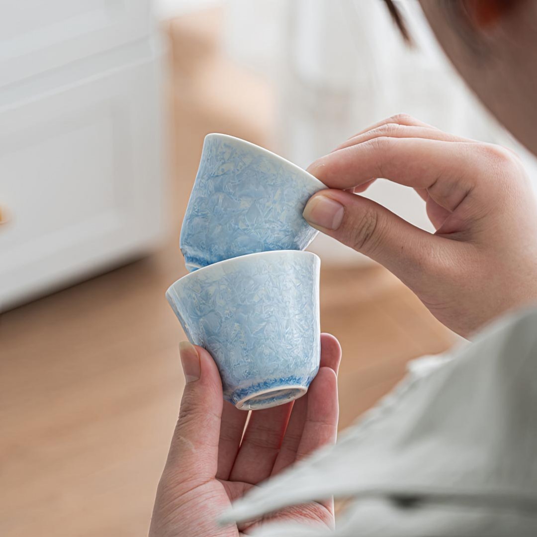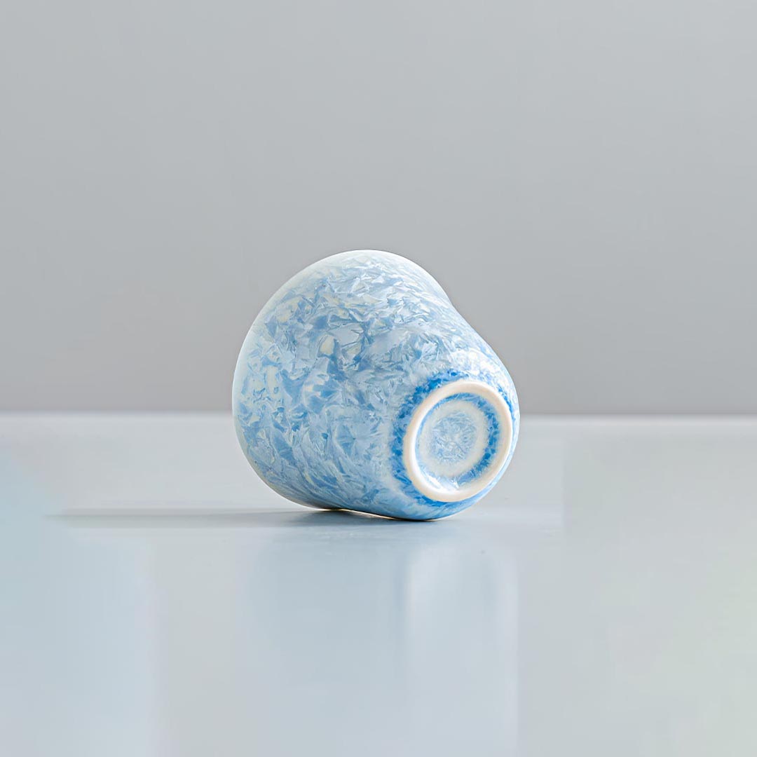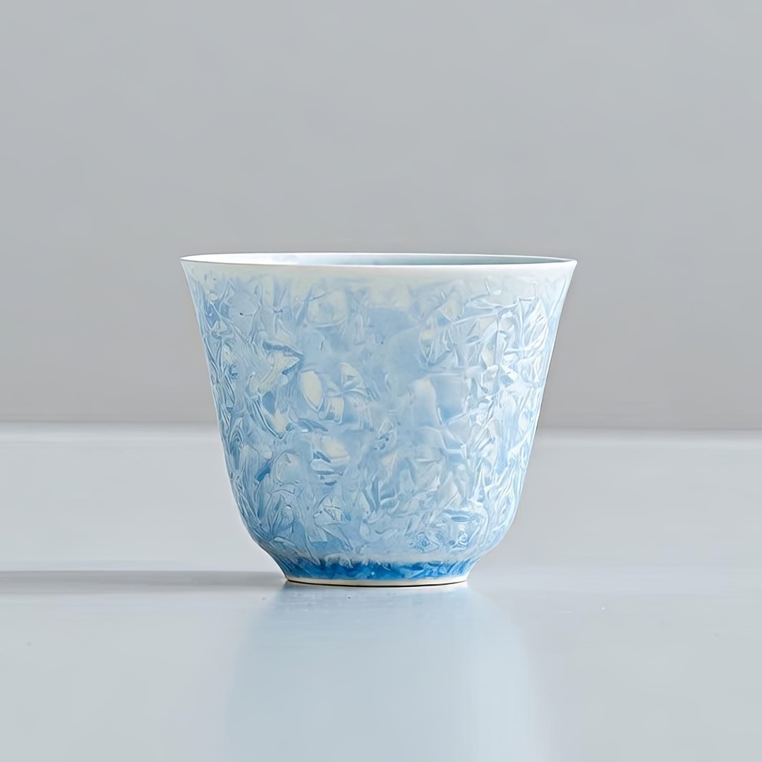 Утонченная фарфоровая пиала родом из Цюаньчжоу, провинция Фуцзянь. Стенки тоньше средних. Пиала покрыта авторской глазурью, которой автор дал имя “Голубой Лед”.