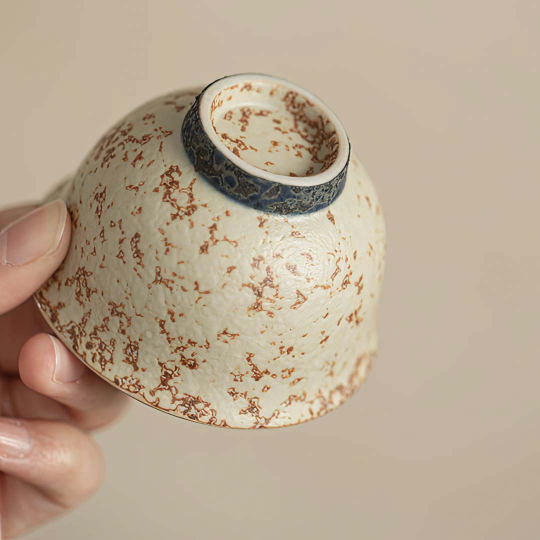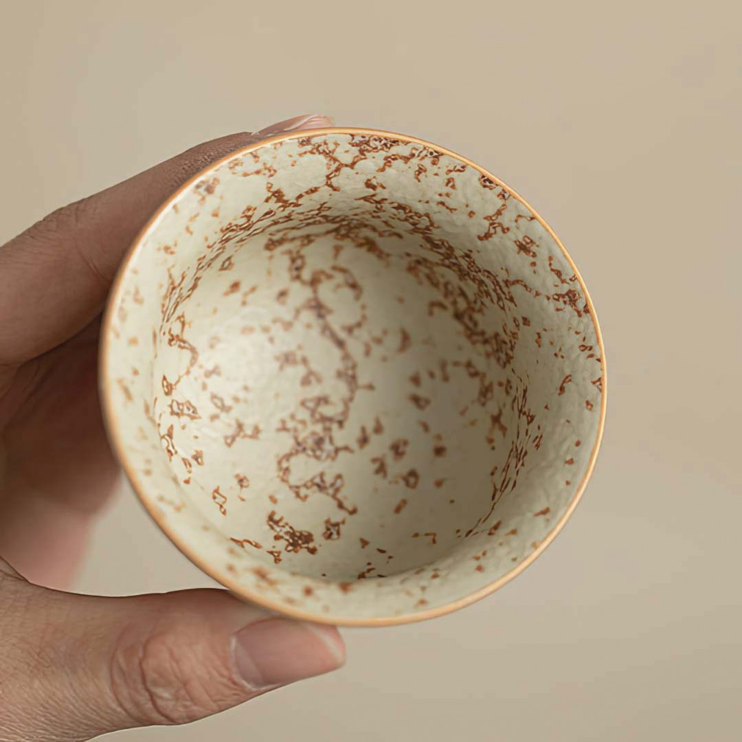 Керамическая пиала родом из провинции Фуцзянь. Стенки чуть тоньше средних. Пиала покрыта авторской глазурью, имитирующей древний камень с золотой инкрустацией.