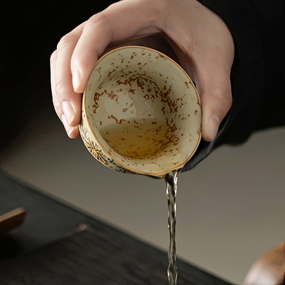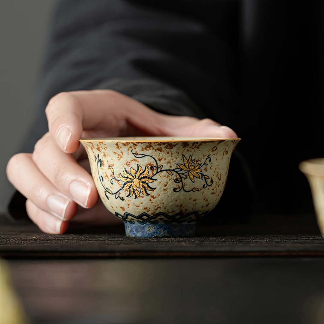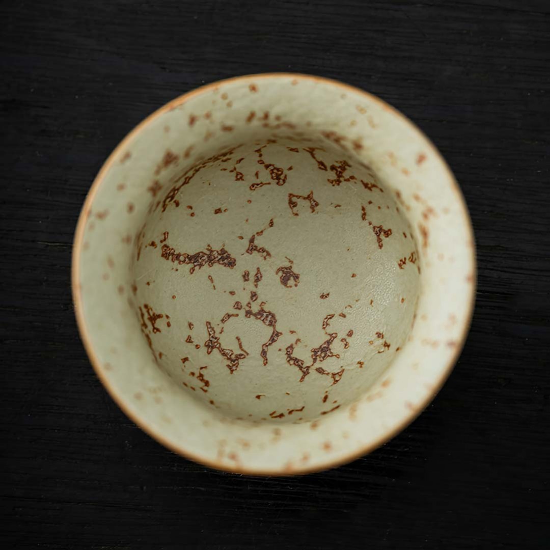 Керамическая пиала родом из провинции Фуцзянь. Стенки чуть тоньше средних. Пиала покрыта авторской глазурью, имитирующей древний камень с золотой инкрустацией.
