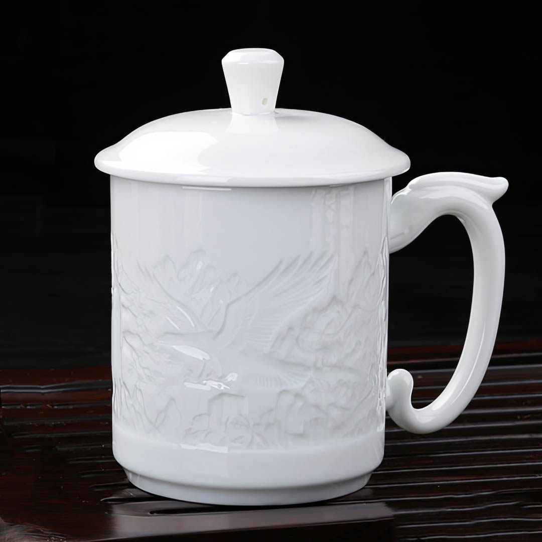 Фарфоровая чашка с крышечкой. Покрыта глянцевой глазурью.Украшена фактурным изображением Орла.Объем:Рабочий объем - 340 мл.Приятного чаепития! Читать полностью