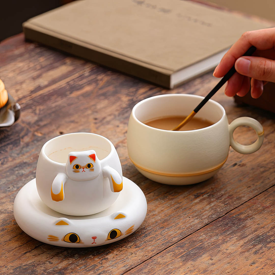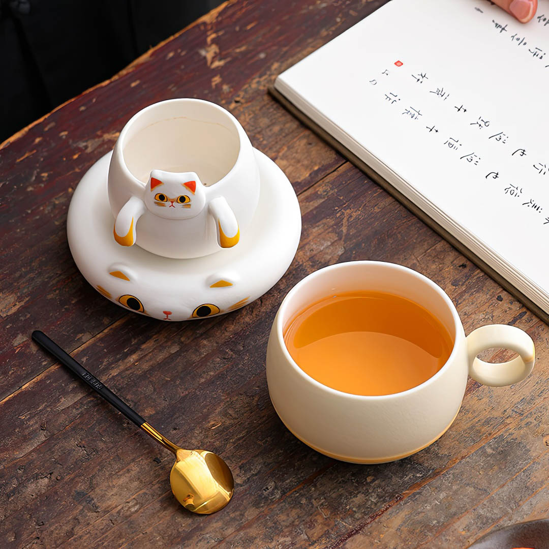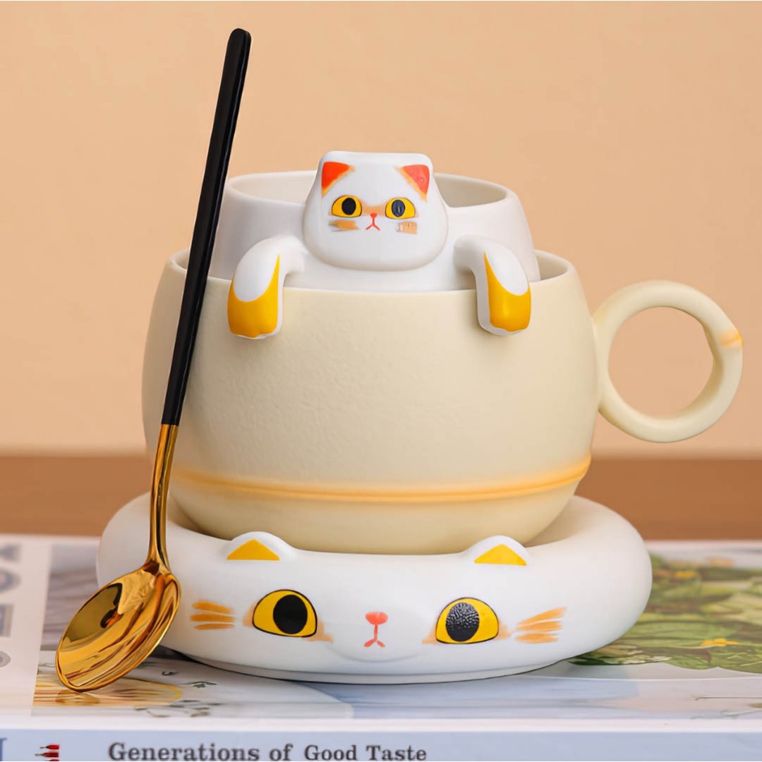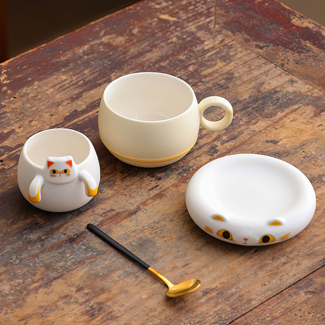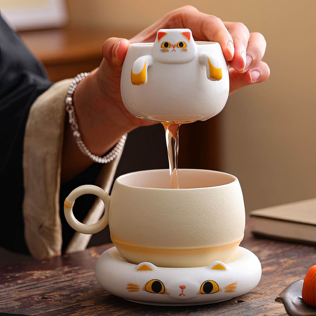 Фарфоровая чашка с ситом, блюдцем и ложечкой. Снаружи покрыта матовой глазурью, а внутри - глянец. Блюдце и сито стилизованы под Рыжего Котика.