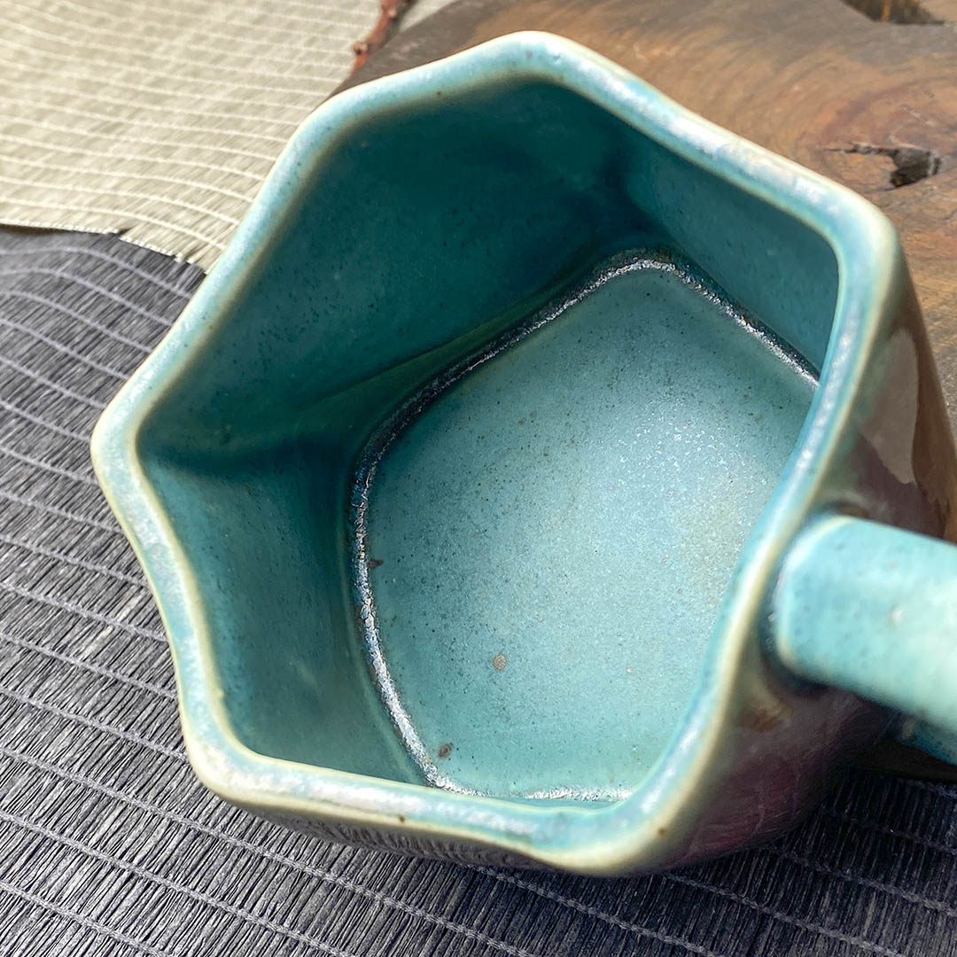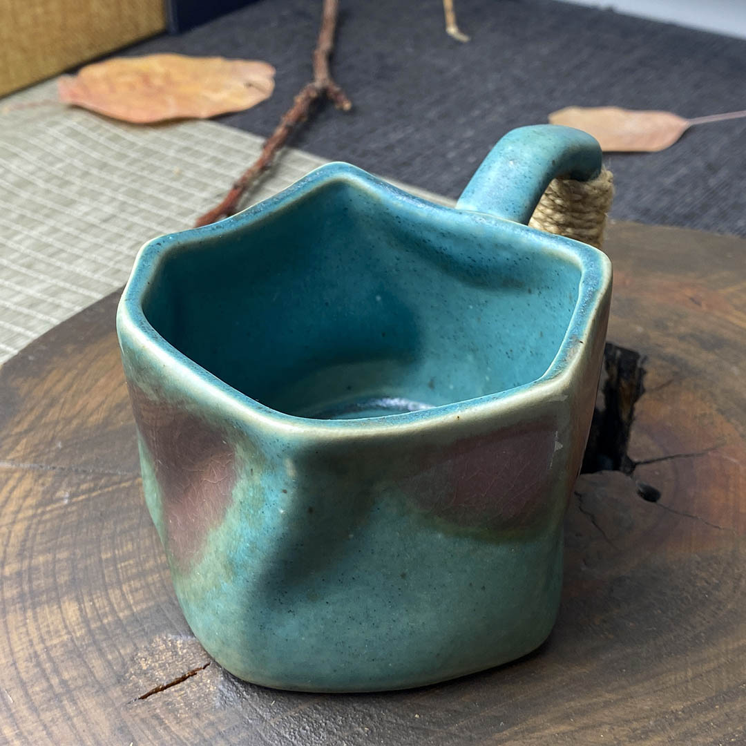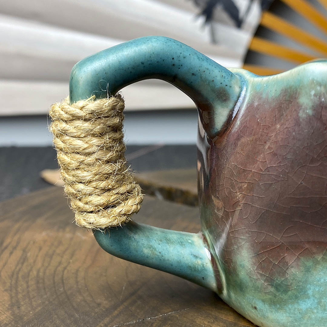 Керамическая чашка родом из Дэхуа. Стенки средней толщины. Ручка перевязана небольшой веревочкой, дабы избежать ожогов при нагревании изделия.