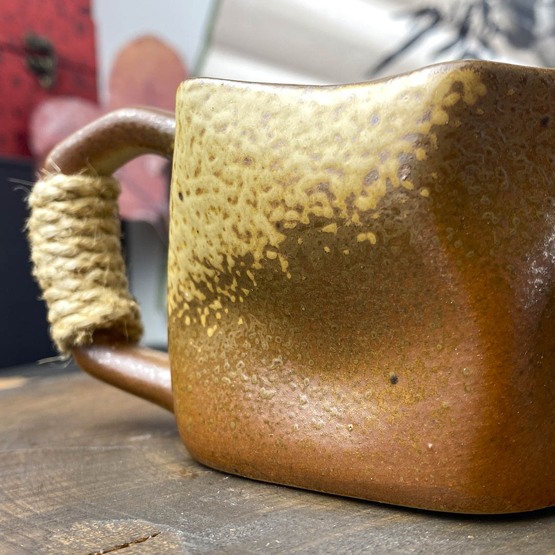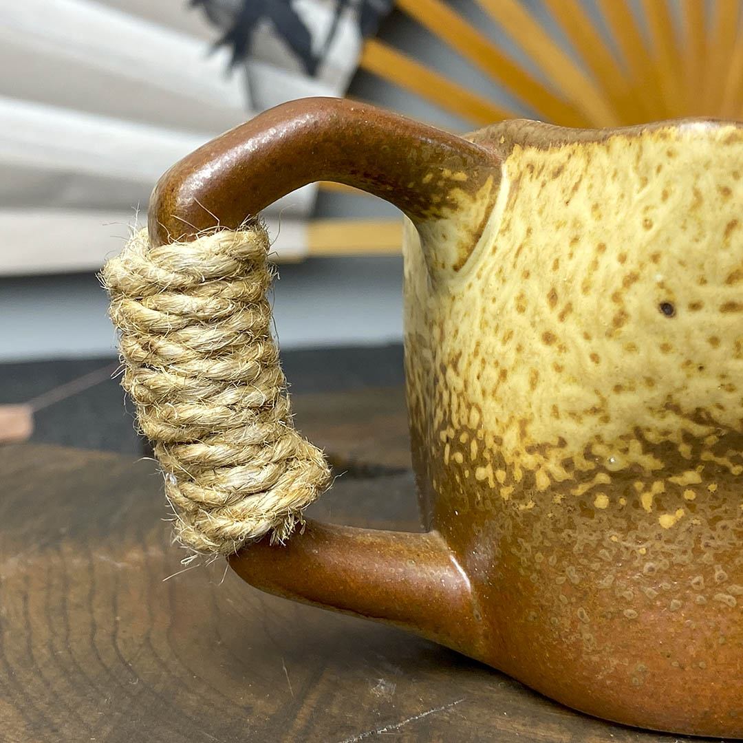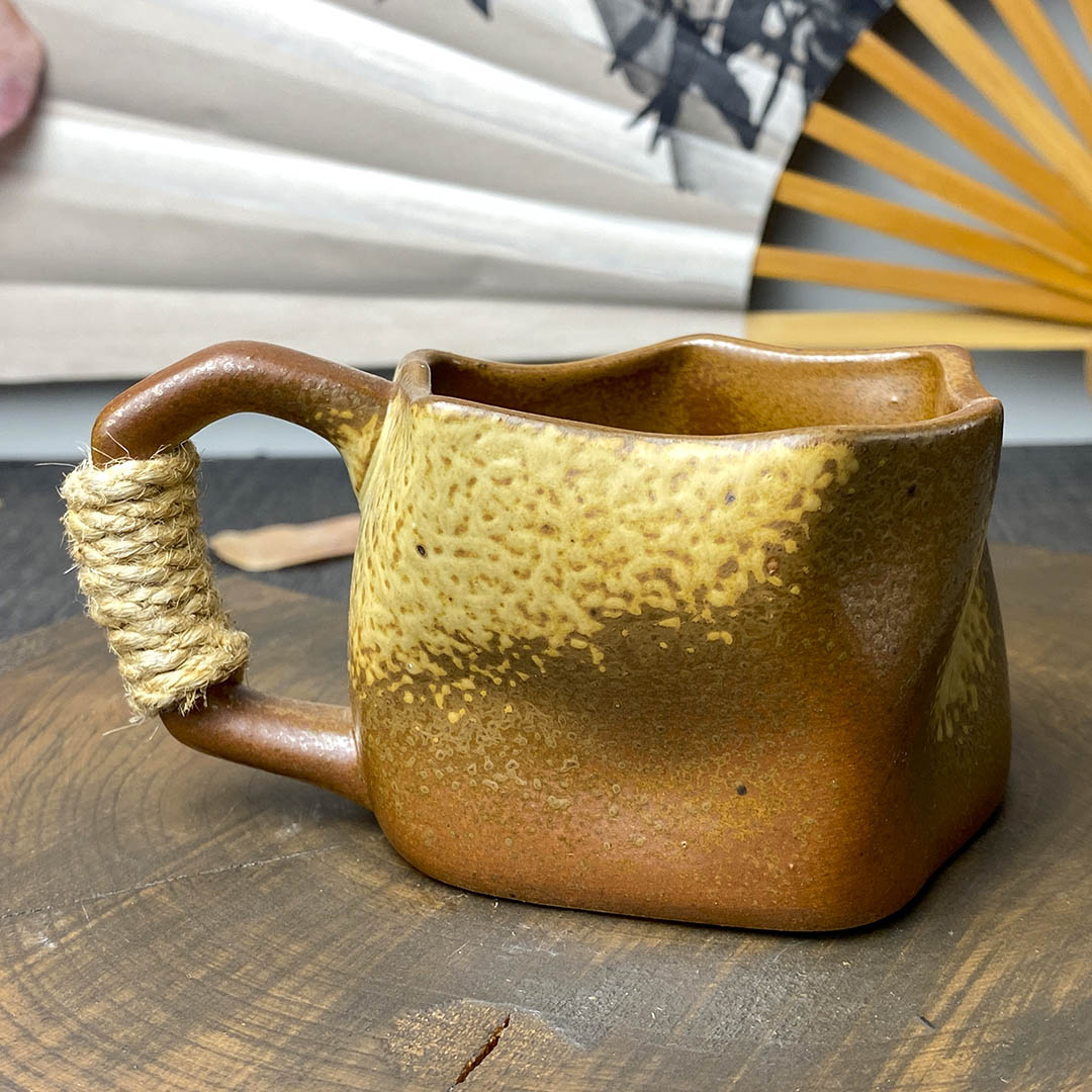 Керамическая чашка родом из Дэхуа. Стенки средней толщины. Ручка перевязана небольшой веревочкой, дабы избежать ожогов при нагревании изделия.