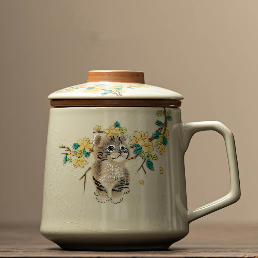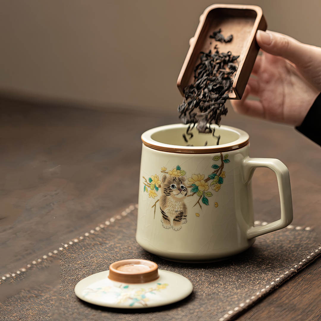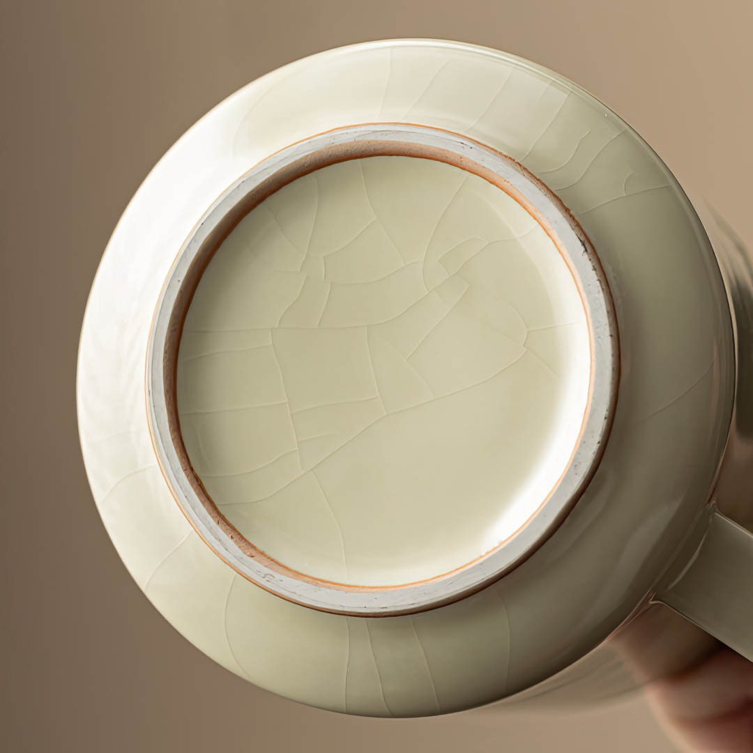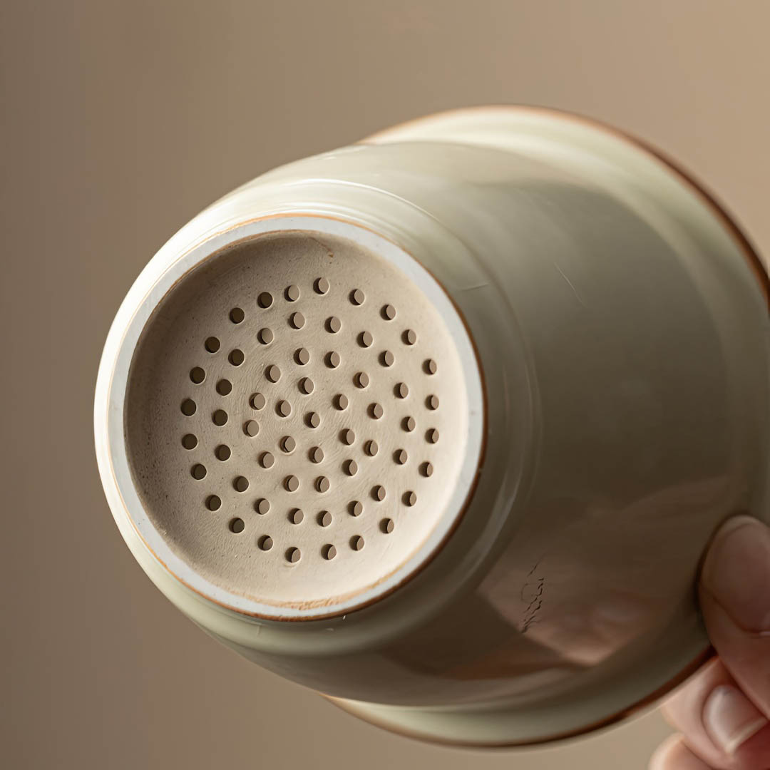 Керамическая чашка с крышкой и ситом. Покрыта глазурью Жу Яо, ее особенность заключается в том, что она покрыта паутинкой мельчайших трещин, которые постепенно заполняются чаем и проявляют уникальный для каждой пиалы рисунок, придавая изделию особый, таинственный налет времени.