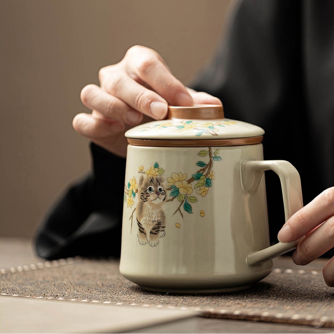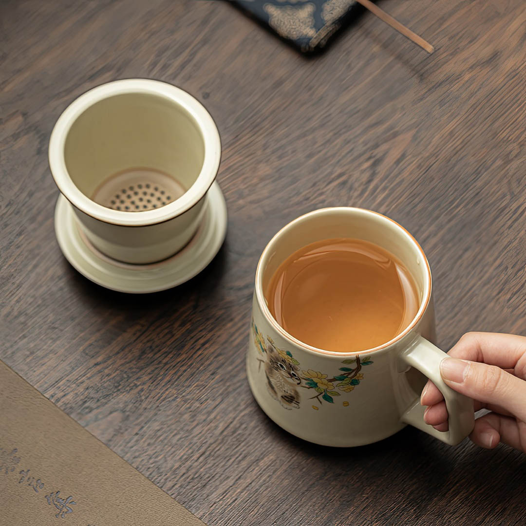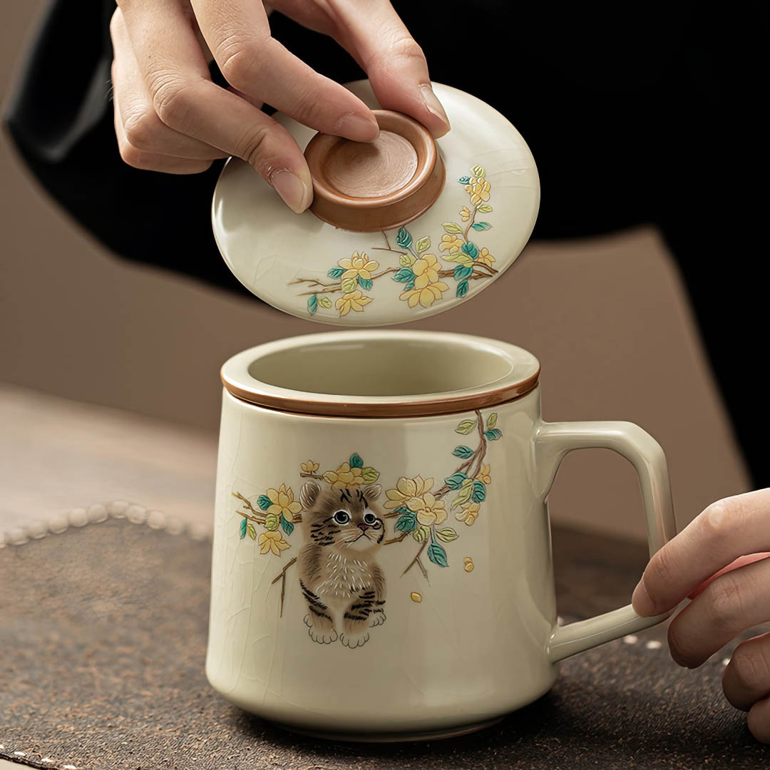 Керамическая чашка с крышкой и ситом. Покрыта глазурью Жу Яо, ее особенность заключается в том, что она покрыта паутинкой мельчайших трещин, которые постепенно заполняются чаем и проявляют уникальный для каждой пиалы рисунок, придавая изделию особый, таинственный налет времени.