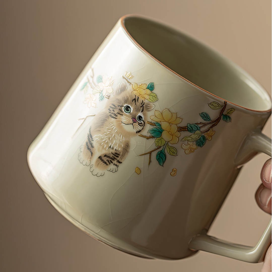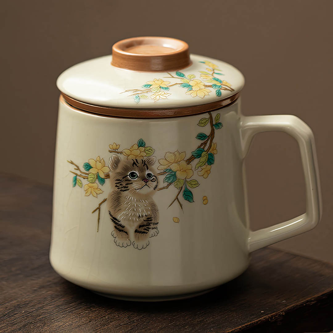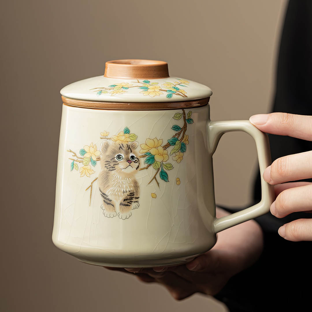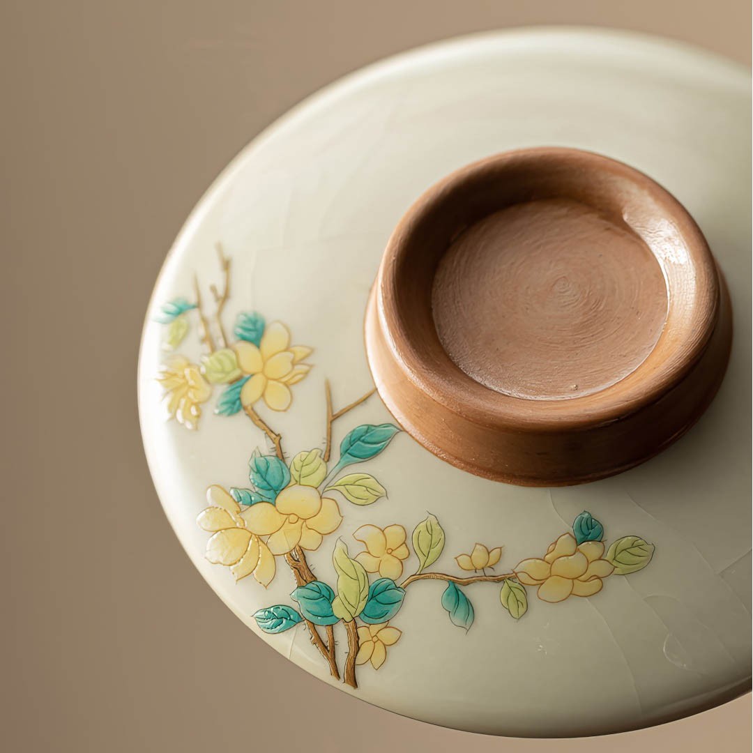 Керамическая чашка с крышкой и ситом. Покрыта глазурью Жу Яо, ее особенность заключается в том, что она покрыта паутинкой мельчайших трещин, которые постепенно заполняются чаем и проявляют уникальный для каждой пиалы рисунок, придавая изделию особый, таинственный налет времени.