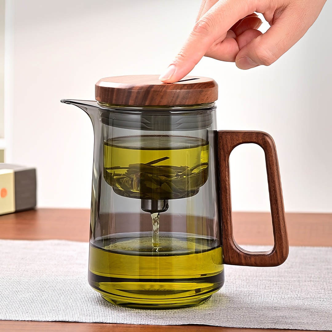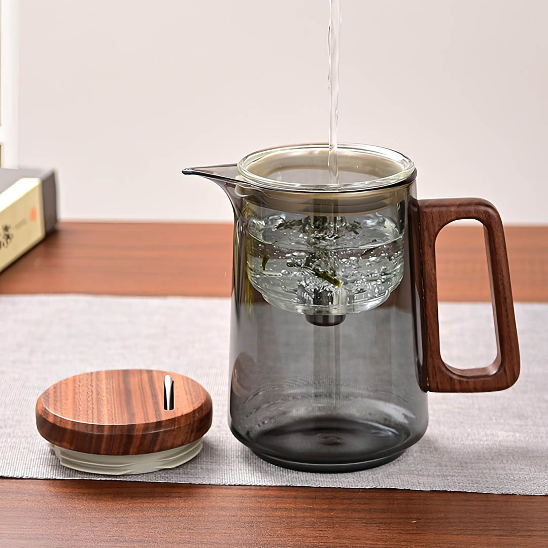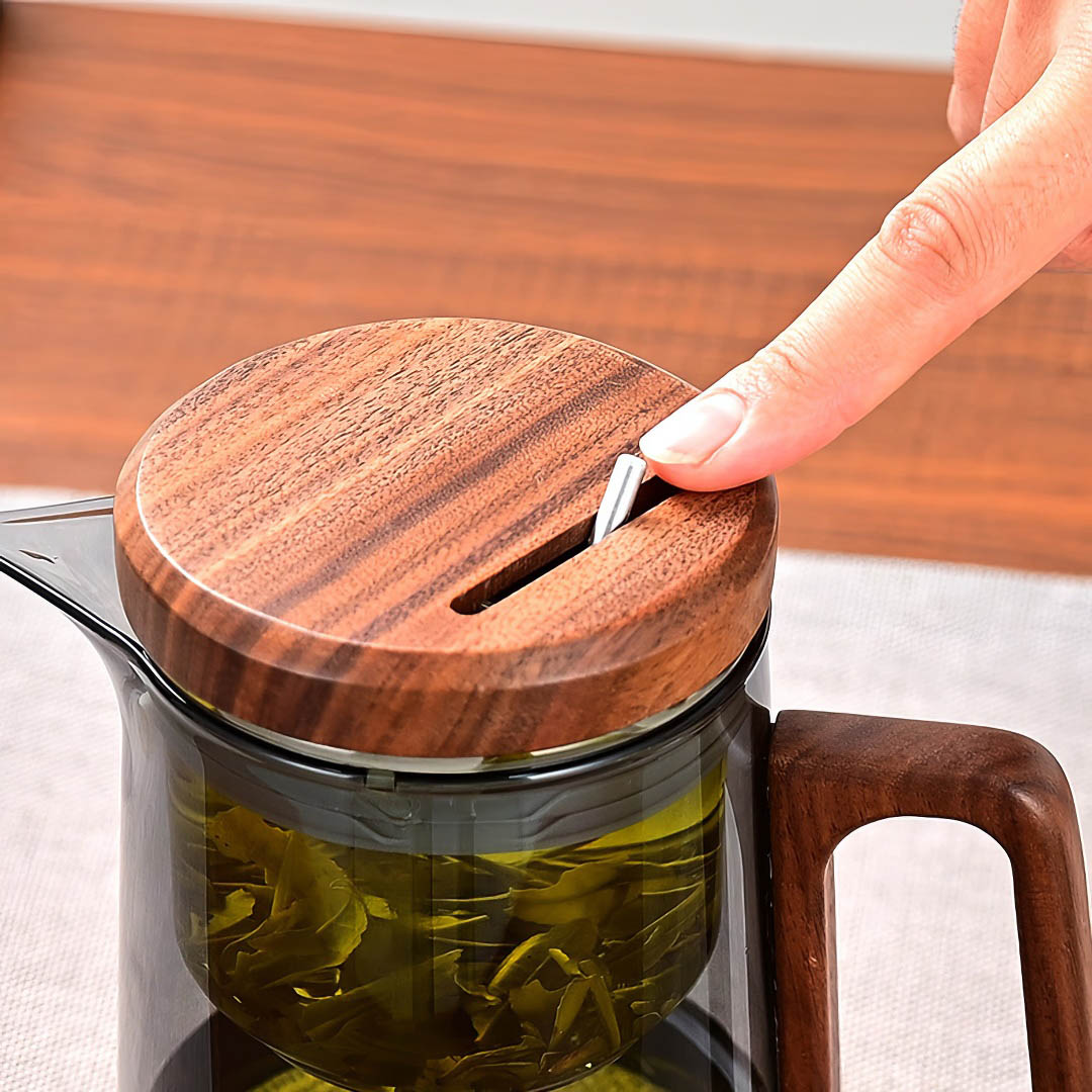 Заварник для чая из термостойкого стекла. Внутри — съемный металлический фильтр/колба для заварки, крышка — деревянная с магнитным рычажком для слива.