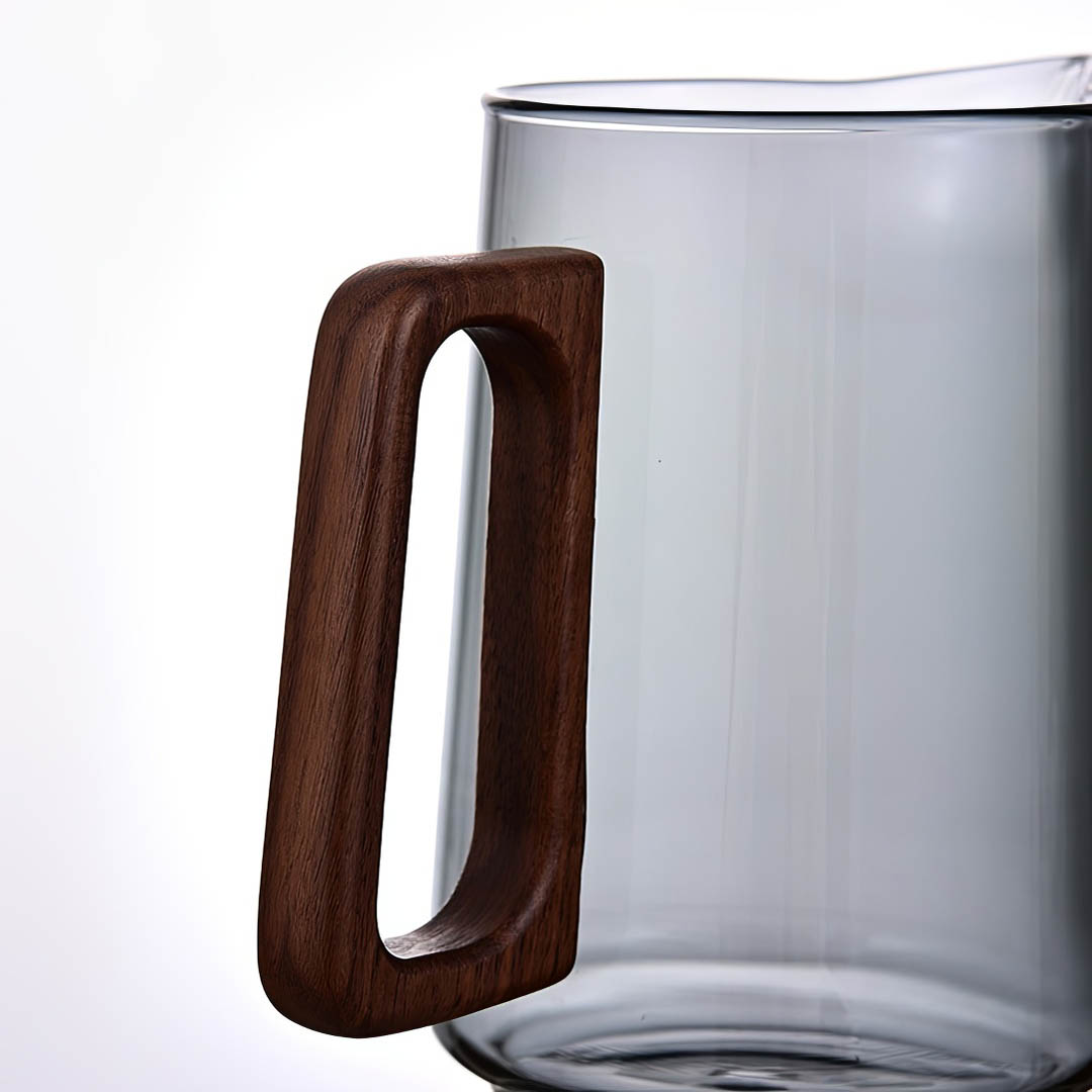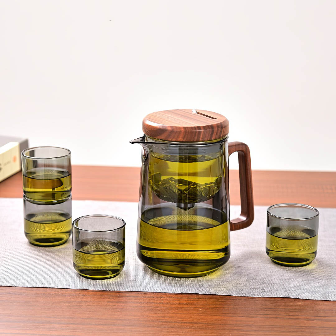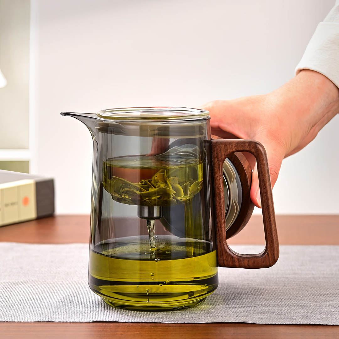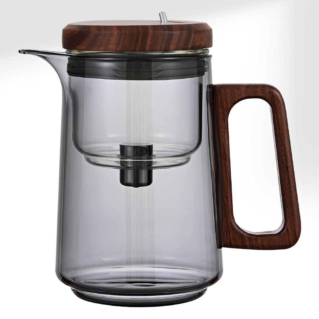 Заварник для чая из термостойкого стекла. Внутри — съемный металлический фильтр/колба для заварки, крышка — деревянная с магнитным рычажком для слива.