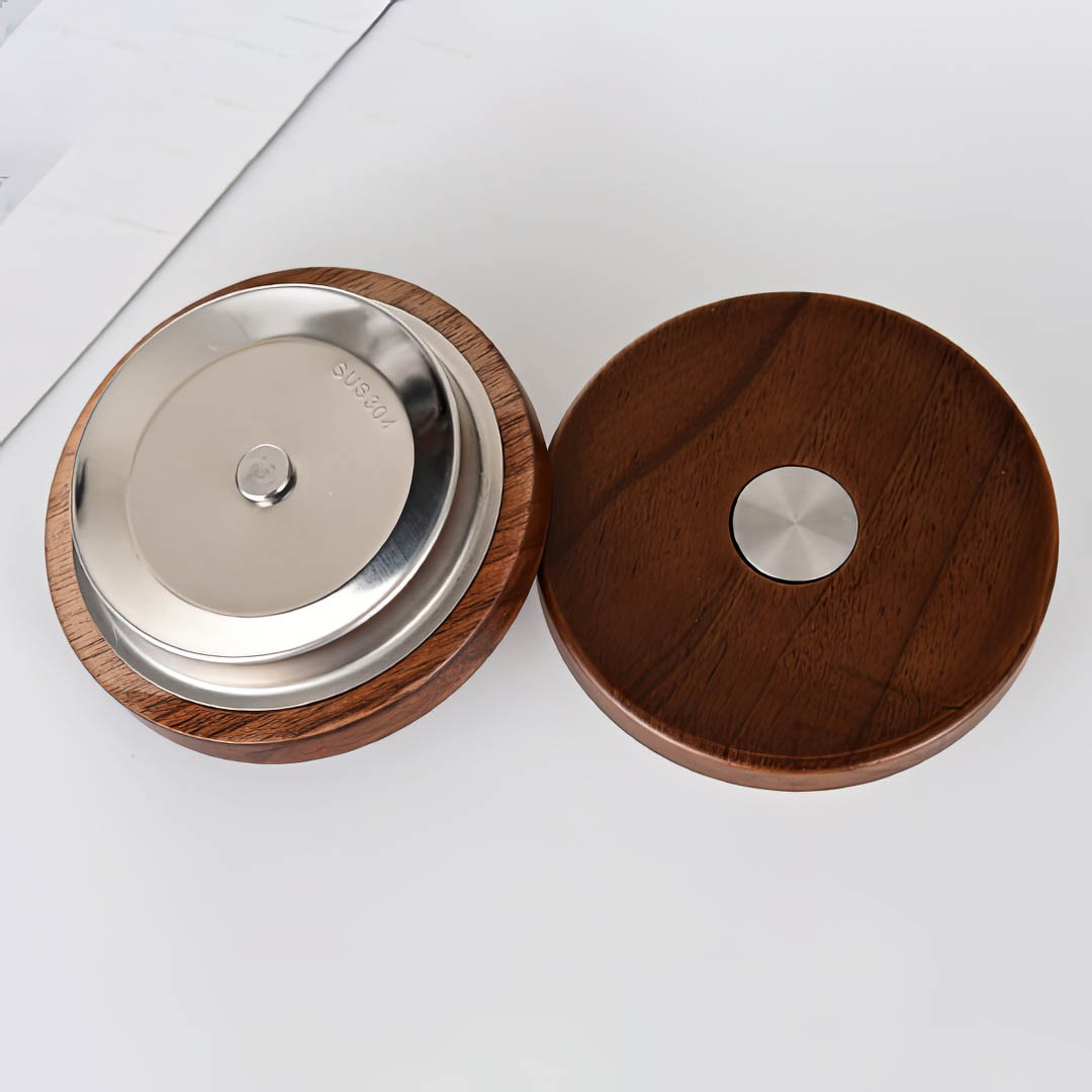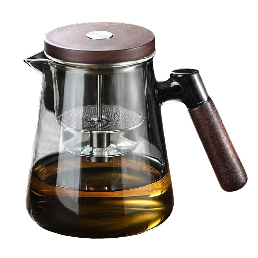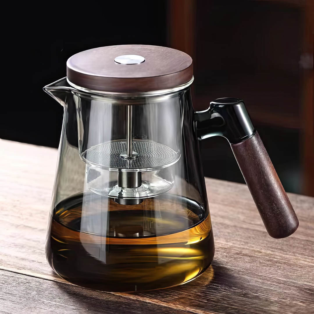 Заварник для чая из термостойкого стекла. Внутри — съемный металлический фильтр/колба для заварки, крышка — деревянная с металлической кнопкой по центру.