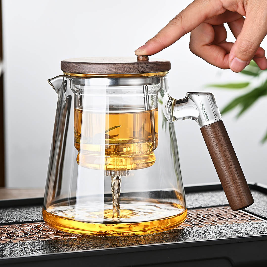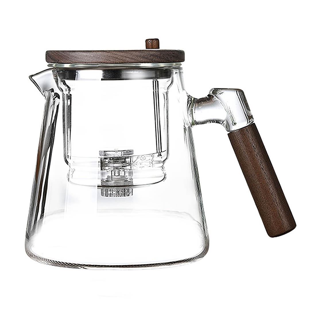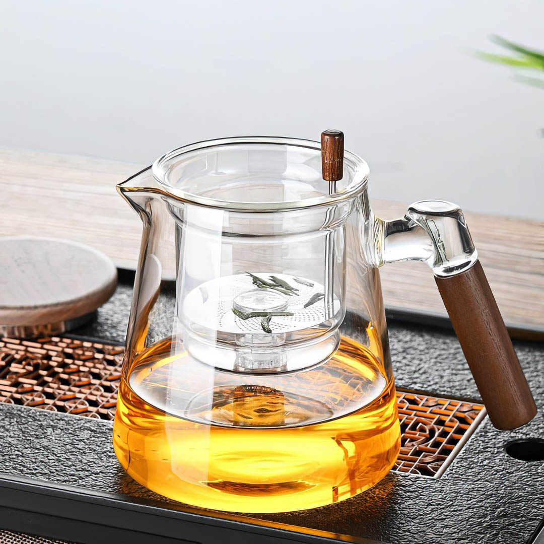 Заварник для чая из термостойкого стекла. Внутри — съемный металлический фильтр/колба для заварки, крышка — деревянная с металлическим рычажком.