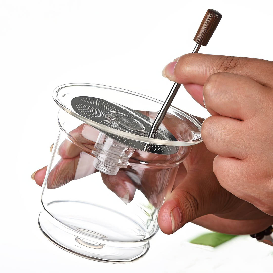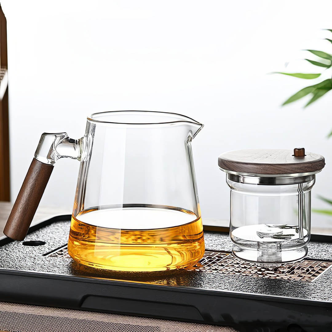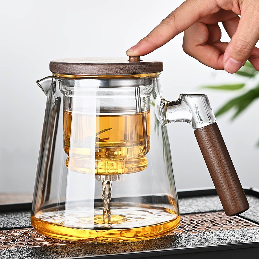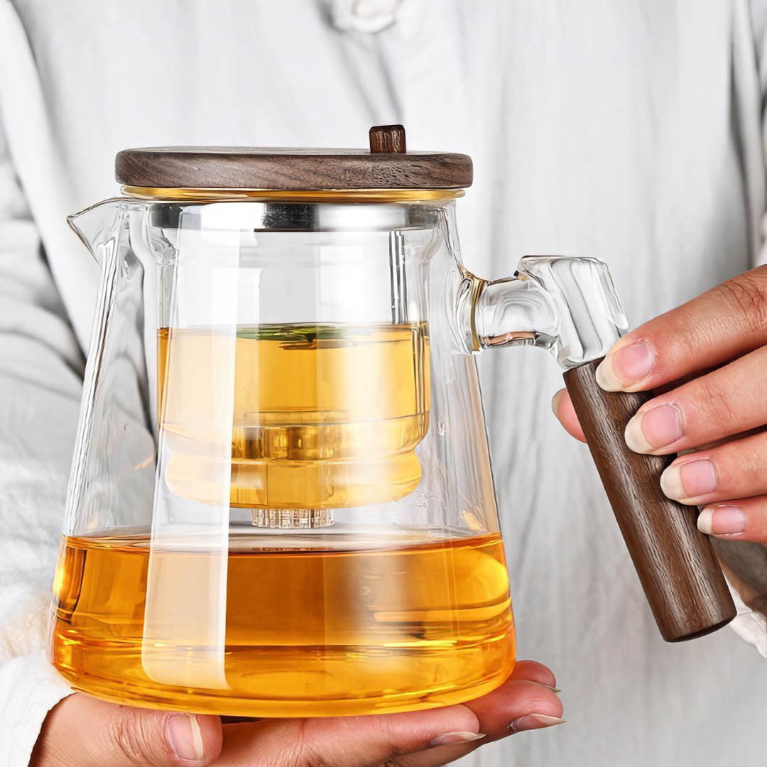 Заварник для чая из термостойкого стекла. Внутри — съемный металлический фильтр/колба для заварки, крышка — деревянная с металлическим рычажком.